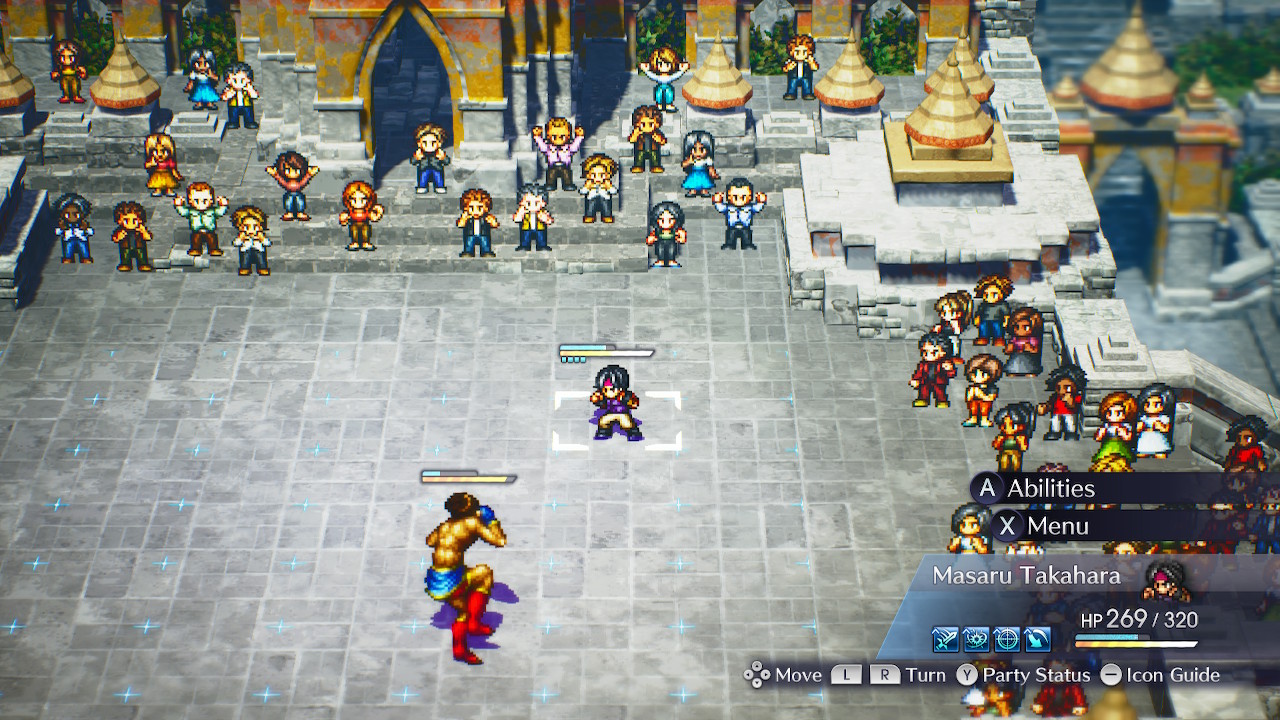 เกมนี้นำเสนองานภาพในสไตล์ที่ Square Enix เรียกอย่างเป็นทางการว่า HD-2D ซึ่งผสานงานภาพในแบบสไปรต์พิกเซล 2D เข้ากับโมเดลฉากหลังและวัตถุประกอบฉากในแบบโพลีกอน HD รวมถึงบรรดาเอฟเฟคต์ต่าง ๆ ที่ก็ทำออกมาได้สวยงามและรุนแรงครับ ที่สำคัญคือแต่ละท่าออกแบบมาได้เท่สมกับบรรดาภาพจำของตัวละครในแต่ละรูปแบบที่คุ้นตากันมา ดังนั้นเวลาปะทะกับบอสของแต่ละบทจึงออกมาสวยงามและอลังการอย่างที่ควรจะเป็น