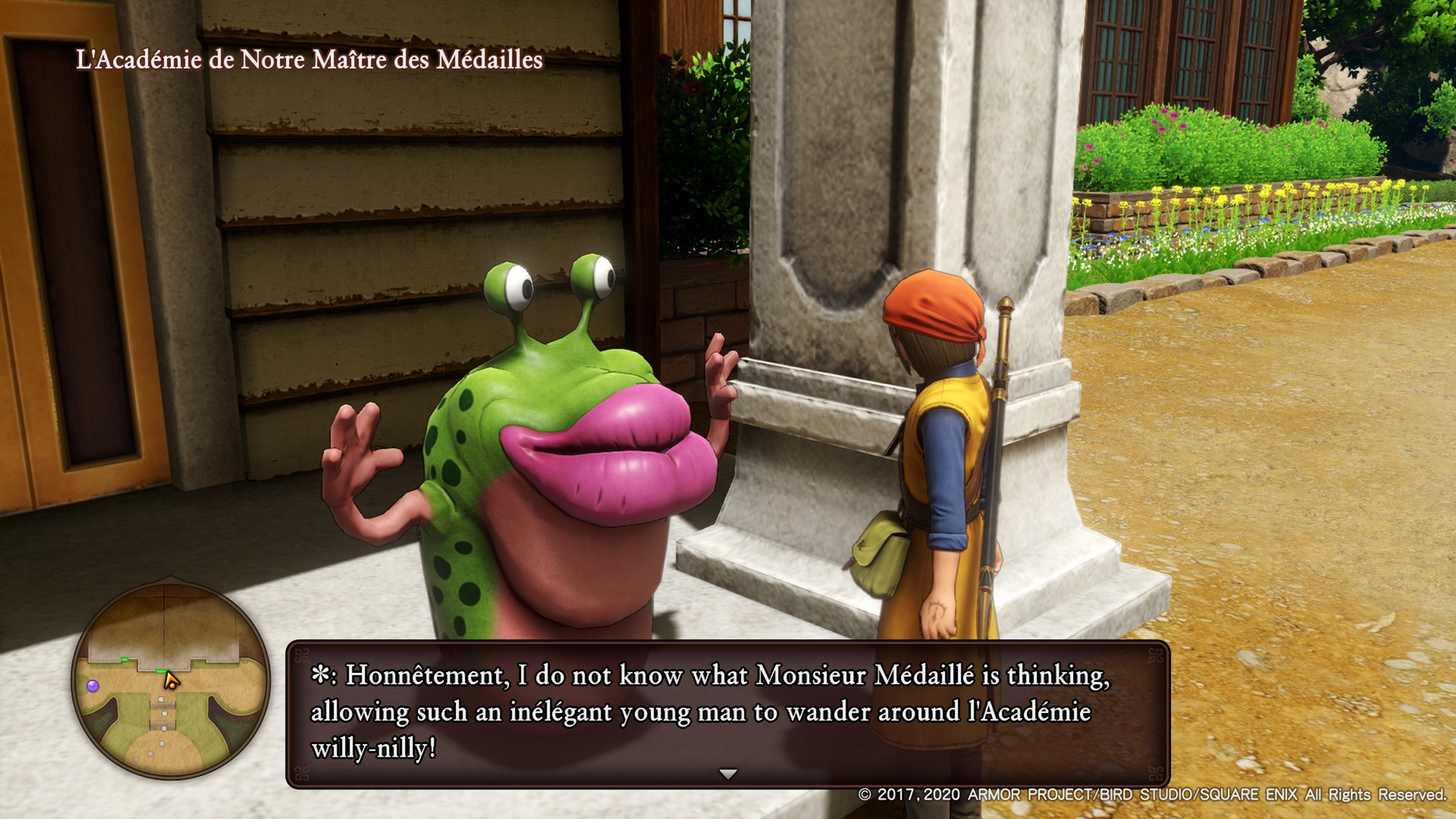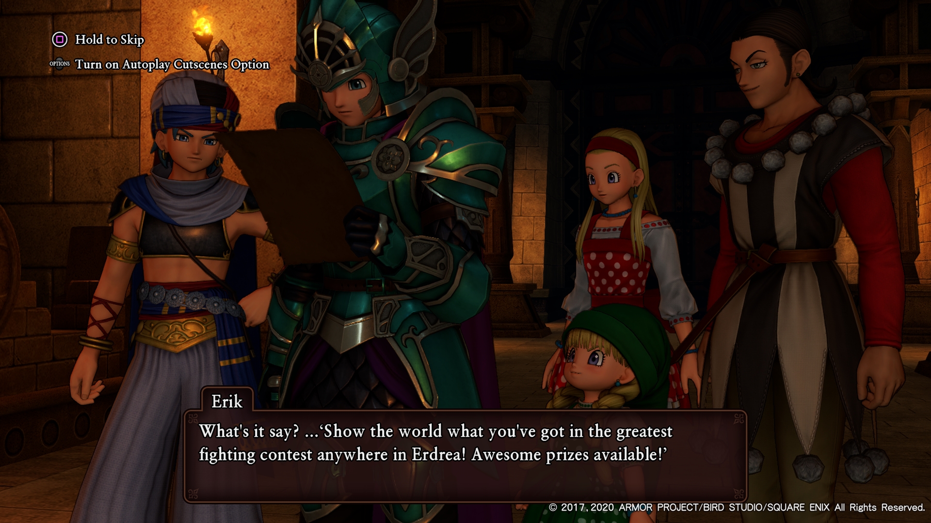 ถ้าจะมีอะไรที่นิยามเนื้อเรื่องของดราก้อนเควสต์ในภาคนี้ได้ดีที่สุดก็คงไม่พ้นคำว่า “คลาสสิก” ครับ โดยส่วนตัวผมเองไม่ได้เป็นแฟนซีรีส์ที่ติดตามดราก้อนเควสต์มาอย่างเหนียวแน่น แต่ก็พอได้รับรู้เอกลักษณ์บางประการของซีรีส์มาบ้างเหมือนกัน แทบทุกภาคจะต้องมีผู้กล้าที่เป็น The Chosen One จากเหล่าปวงเทพที่ถือกำเนิดขึ้นมาในยุคเข็ญเพื่อปราบมารร้าย ซึ่งในภาค XI นี้ก็ไม่ต่างกันครับ สไตล์การดำเนินเรื่องในช่วงต้นจะเต็มไปด้วยความเรียบง่าย และรักษาขนบเช่นว่าเอาไว้ได้ไม่เสื่อมคลาย ทั้งการที่ตัวเอกถือกำเนิดมาเป็นผู้ถูกเลือก เป็นผู้สืบเชื้อสายแห่งราชวงศ์ซึ่งล่มสลายไปในชั่วข้ามคืน เคราะห์ดีที่เจอบุคคลจิตใจงามมาช่วยเหลือและเลี้ยงดูจนเติบใหญ่ ก่อนที่ตัวเอกจะทราบความถึงชาติกำเนิดที่แท้จริงของตนจนตัดสินใจออกเดินทางเพื่อไปทำตามชะตาที่ฟ้ากำหนด