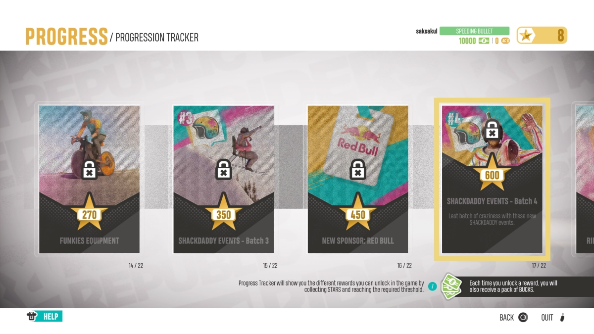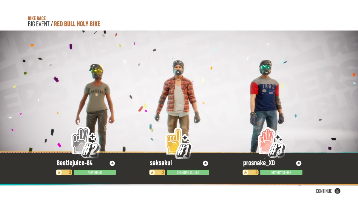 RIDERS REPUBLIC เป็นเกมออนไลน์มัลติเพลเยอร์โดยพื้นฐานครับ เมื่อคุณเข้าสู่เกม นั่นหมายความว่า คุณกำลังจะปั้นตัวเองเป็นนักแข่งอาชีพ ดังนั้นตัวเกมจะพยายามกระตุ้นให้คุณเพิ่มแรงกิ้งของตัวเอง ด้วยการลงแข่งในรายการต่าง ๆ เพื่อสะสมแต้มสตาร์ ซึ่งคะแนนดาวทองนี่แหละ คือสิ่งที่คุณจะต้องใช้ปลดล็อครายการแข่งระดับสูงต่อไป
