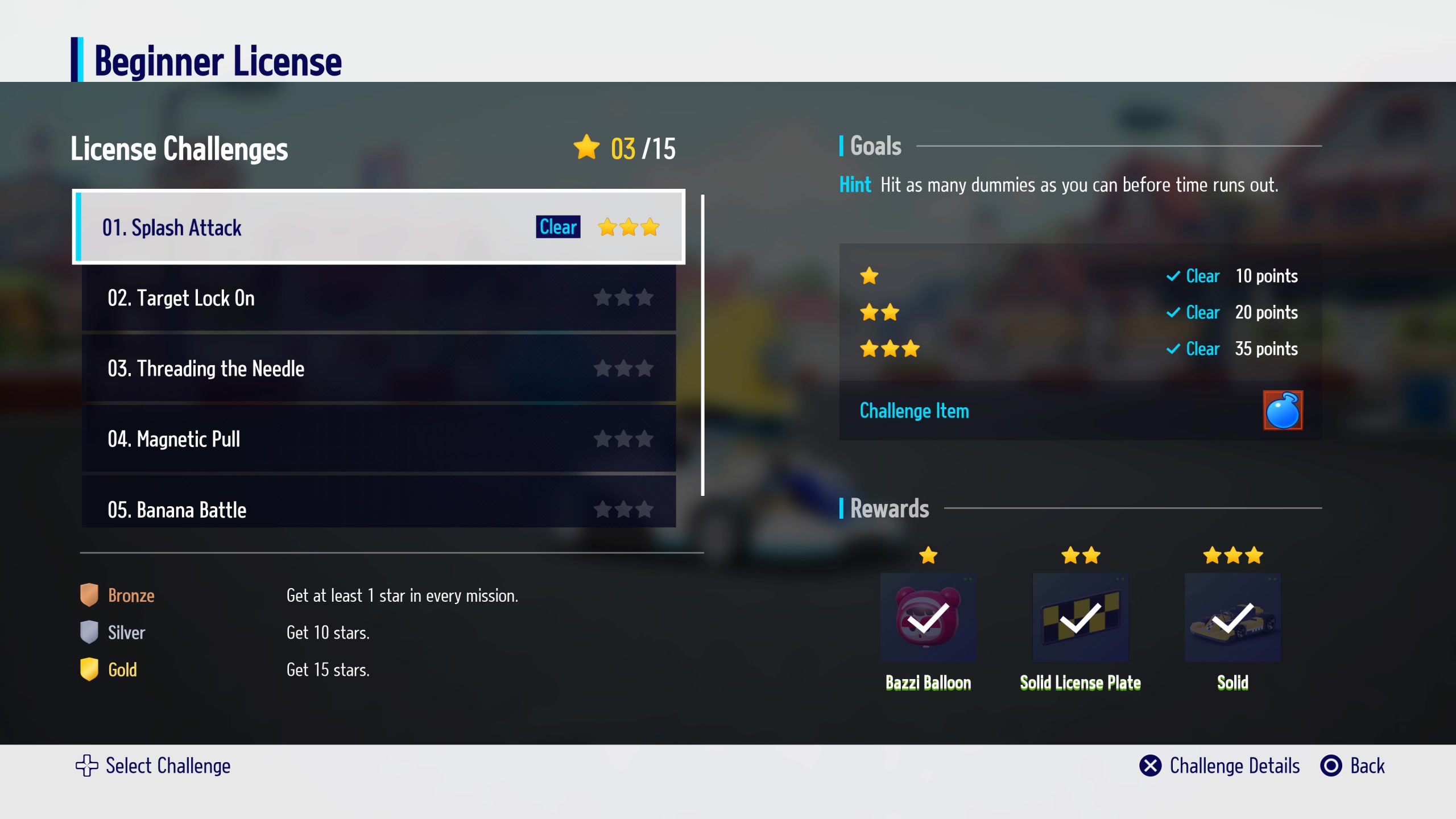 การสอบใบขับขี่ของเกมนี้จะมีลักษณะเป็นการเล่นคล้าย ๆ มินิเกมที่จะมีเงื่อนไขต่าง ๆ กันไป บ้างก็ต้องใช้ไอเทมเพื่อดักจับหุ่นที่ขับรถไปมาให้ได้มากที่สุด บ้างก็เป็นการขับหลบสิ่งกีดขวางที่จะโผล่ในแบบกระชั้นชิดตลอดเส้นทางเพื่อเข้าเส้นชัยในเวลาที่กำหนด ซึ่งยิ่งคุณทำคะแนนได้ดีก็ยิ่งมีโอกาสปลดล็อคอะไรดี ๆ มาใช้ และการแข่งชนิดใหม่ ๆ ก็จะปลดได้ต่อเมื่อคุณผ่านใบขับขี่ในระดับที่กำหนดเท่านั้นด้วย