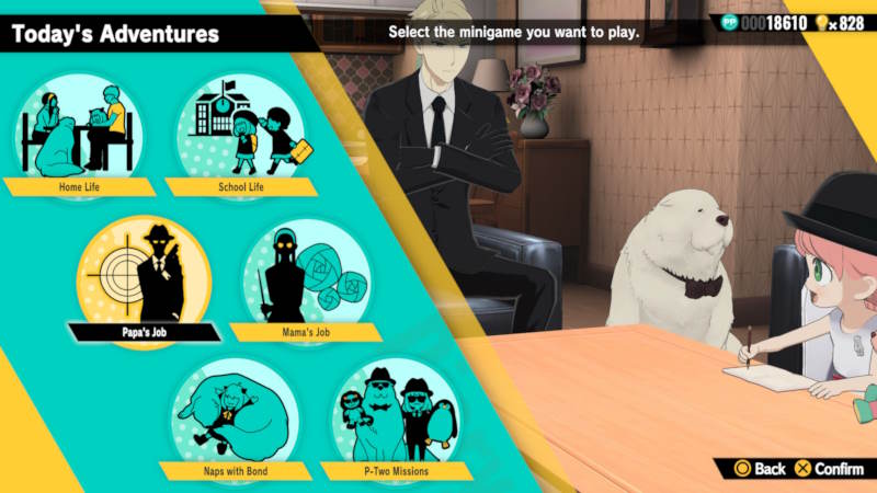 จากนั้นคนเล่นจะได้สัมผัสเรื่องราวสุดน่ารักของครอบครัวฟอร์เจอร์ผ่านมุมมองของลูกสาวอย่างอาเนีย สัมผัสเรื่องราวของการเป็นสายลับ เรียนรู้การเป็นแม่ที่ดี รวมถึงสัมผัสความอบอุ่นของครอบครัวนี้ได้ด้วย ผ่านฉากสนทนาและคัตซีนที่เป็นการ์ตูนดูได้แบบเพลิน ๆ