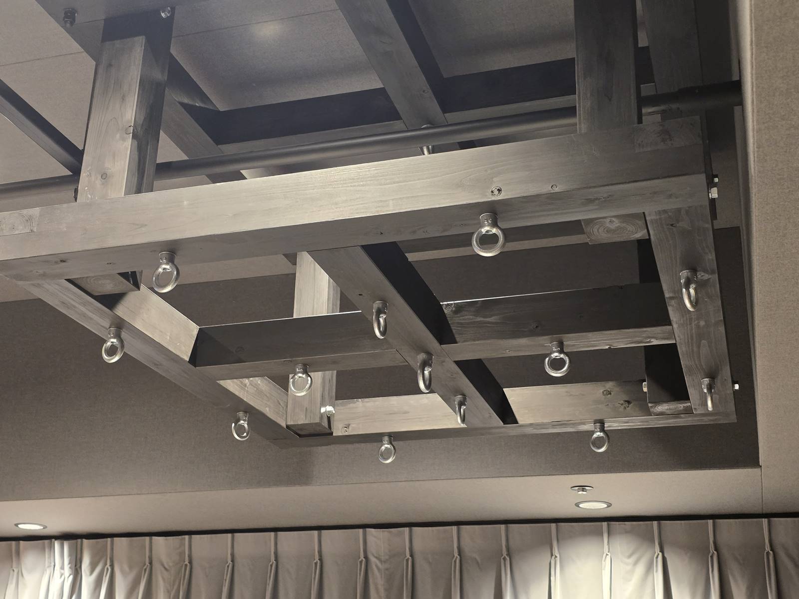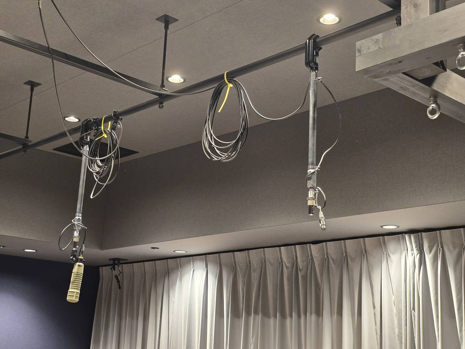 ที่ด้านบนของเพดานก็จะมีคานที่สามารถรับน้ำหนักได้หนึ่งร้อยกิโลกรัม เพื่อเอาไว้แขวนกระสอบทรายในตอนที่ต้องการสร้างเสียงการกระแทกหรือการกระทบนั่นเองครับ ไม่เพียงเท่านั้นแต่ยังติดตั้งไมค์ให้ห้อยลงมาจากเพดานเพื่อที่ว่าเวลาจะอัดเสียงอะไรก็จะไม่มีเสียงรบกวนเช่นกันและยังทำให้กระบวนการเร็วขึ้นด้วย