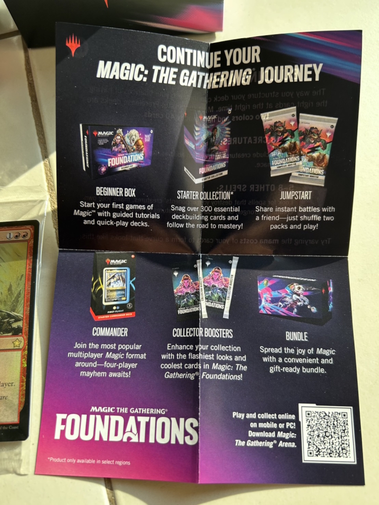 Magic The Gathering: Foundations ประกอบด้วยผลิตภัณฑ์ Beginner Box, Starter Collection, Play Booster, Collector Booster, Foundations Jumpstart Booster, Prerelease Pack, และ Bundle สำหรับรายละเอียดเพิ่มเติมอื่น ๆ สามารถดูได้ที่เว็บไซต์: https://magic.wizards.com/en/products/foundations