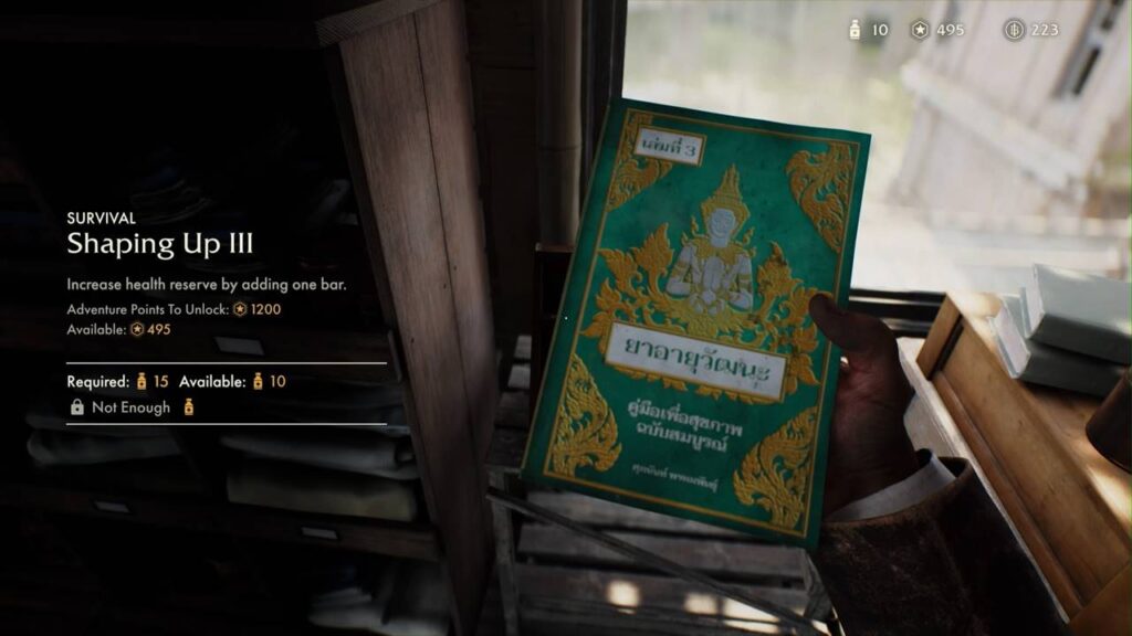 อย่างที่ผมบอกไปก่อนหน้านี้ว่าเกมนี้มีระบบเงินให้คุณใช้ซื้อของ ซึ่งเงินในเกมนี้คุณจะหาได้จากการสำรวจครับ ตามตู้โต๊ะชั้นวางของ ในกล่องเก็บของ หรือบางทีก็ได้จากการไขปริศนาตู้เซฟ และของส่วนใหญ่ที่จำเป็นต้องซื้อก็เป็นพวกหนังสือสกิล หรือไม่ก็เป็นพวกแผนที่บอกจุดน่าสนใจนั่นล่ะครับ คือถ้าให้พูดง่าย ๆ มันเหมือนเวลาคุณเล่นเกมโอเพนเวิลด์แล้วไปปีนเสาเพื่อเปิดสัญลักษณ์บนแผนที่อะไรทำนองนั้น ซึ่งสิ่งที่ผมคิดว่าเกมนี้ออกแบบมาดีก็คือเงินที่คุณหาได้หรือมีให้ในแต่ละพื้นที่จะเกินกว่าของที่มีให้ซื้อแน่นอน คุณไม่ต้องกลัวว่าจะซื้อของได้ไม่ครบ เพราะเวลาพอคุณซื้อหมดเกมจะบอกเลยว่าพื้นที่นี้ไม่มีอะไรเหลือให้ซื้อแล้ว เงินที่มีเกินก็เอาไปกดหย่อนใส่ตู้บริจาคได้เลย เพราะเวลาคุณเปลี่ยนพื้นที่ใหม่ก็ใช้เงินคนละสกุลอยู่ดี