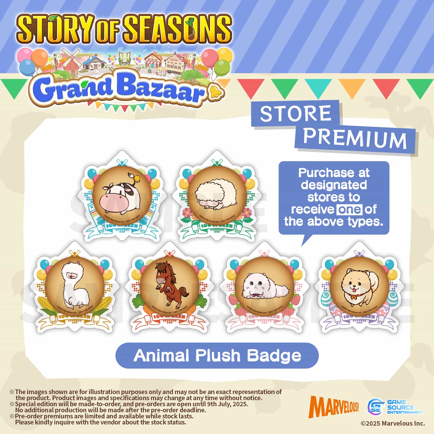 หากสั่งซื้อล่วงหน้า Nintendo Switch™/Nintendo Switch™ 2 Chinese Physical Edition ของ “Story of Seasons: Grand Bazaar” ณ ร้านค้าที่กำหนด จะได้รับโบนัสดังต่อไปนี้ (badge ชิ้นใดชิ้นหนึ่ง)