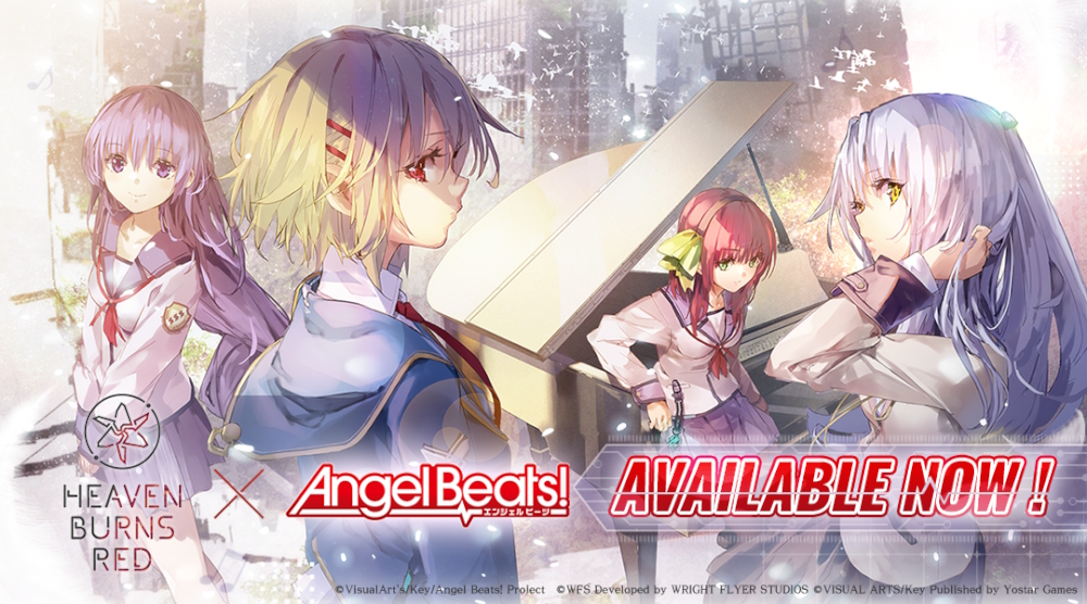 Heaven Burns Red, ประกาศอีเวนต์ความร่วมมือพิเศษกับอนิเมดัง Angel Beats!, เนื่องในโอกาสครบไมล์สโตน 180 วันของเกม ซึ่งอีเวนต์นี้มาพร้อมเนื้อหาใหม่ ตัวละครคอลแล็บเอ็กซ์คลูซีฟสามตัว และรางวัลมากมาย ผู้เล่นจะได้รับสิทธิกาชาฟรี 150 ครั้งผ่านการล็อกอินรายวัน พร้อมด้วยแคมเปญการันตีตัวละคร SS สำหรับตู้ครบรอบและตู้คอลแล็บ อีเวนต์นี้เริ่มตั้งแต่ 16 พฤษภาคม เวลา 00:00 ไปจนถึง 12 มิถุนายนเวลา 23:59 น.