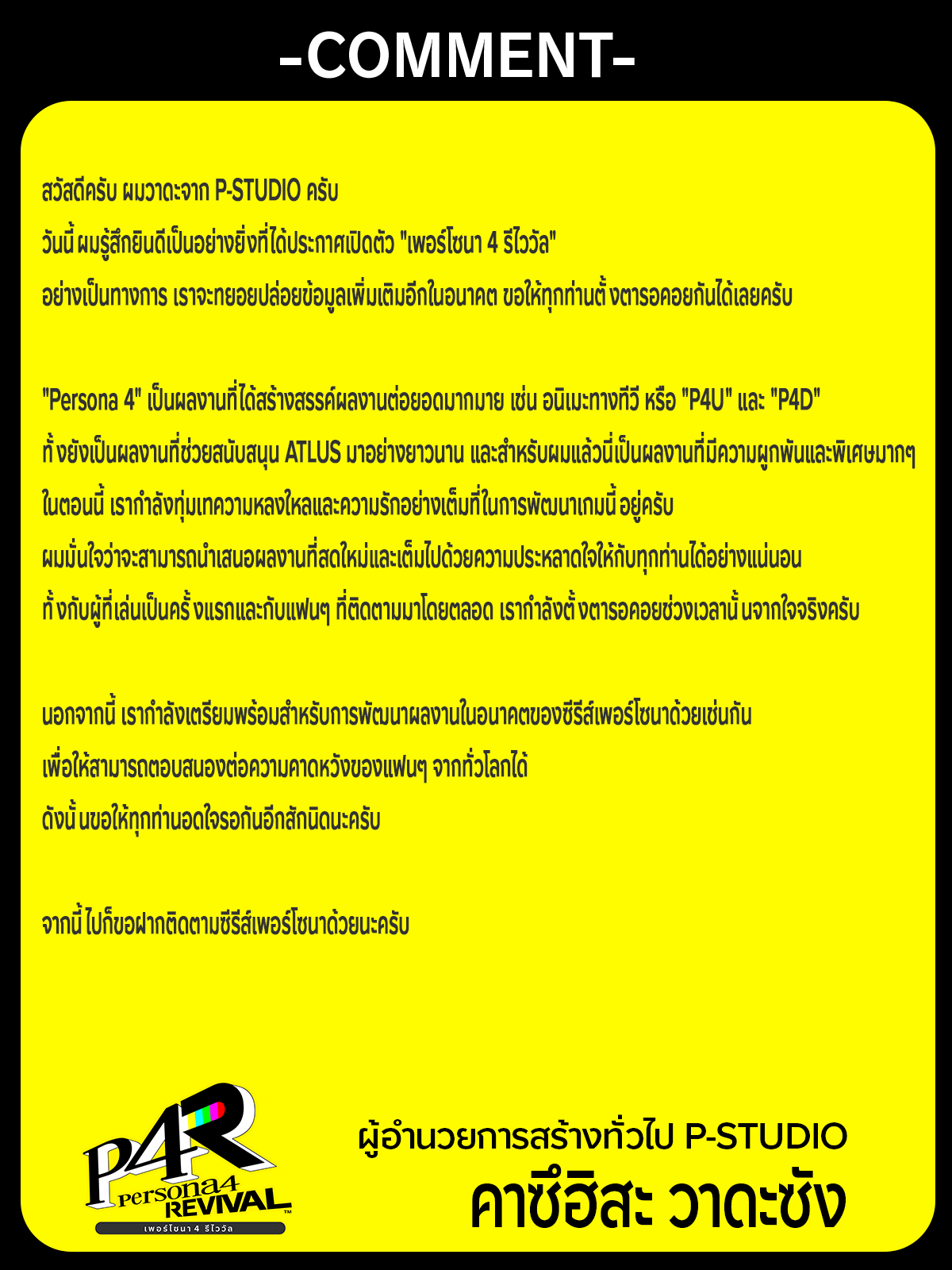 บริษัท SEGA CORPORATION ได้ประกาศว่าจะวางจำหน่าย “เพอร์โซนา 4 รีไววัล” ผลงานใหม่จากซีรีส์สุดฮิตของ ATLUS อย่างเพอร์โซนาไปเป็นที่เรียบร้อยแล้ว โดยมีกำหนดวางจำหน่ายบน Xbox Game Pass, Xbox Series X|S, Windows, PlayStation®5 และ Steam อีกทั้ง ยังได้เผยตัวอย่างทีเซอร์และเว็บไซต์ทีเซอร์ออกมาแล้วด้วยเช่นกัน ขอเชิญรับชมกันได้เลย