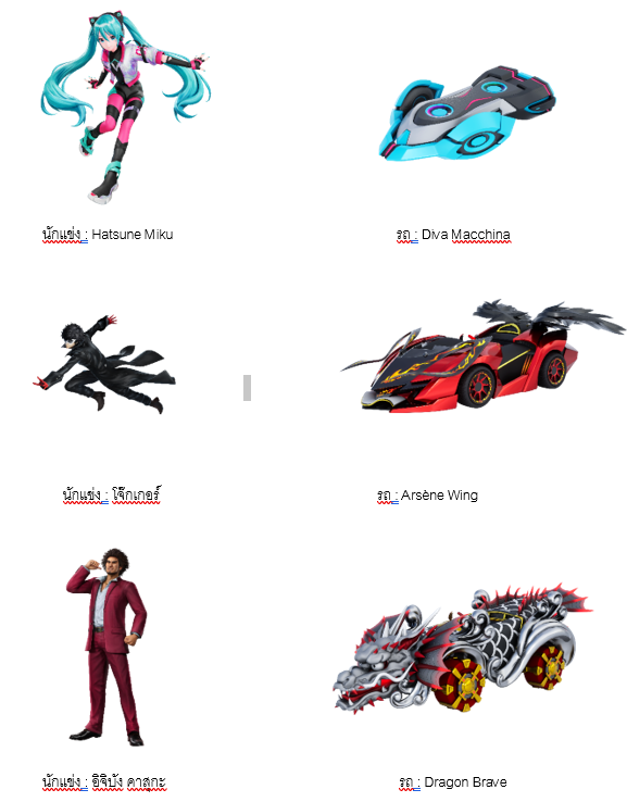 สำหรับฟรีอัปเดต มีกำหนดเพิ่ม Hatsune Miku, โจ๊กเกอร์จาก Persona 5 Royal และอิจิบัง คาสุกะจาก Like a Dragon มาเป็นนักแข่ง พร้อมกับรถสุดออริจินัล โปรดอดใจรอกันได้เลย นอกจากนี้ เราได้เผยคอลแล็บอาร์ตสุดพิเศษของ “Hatsune Miku” เพื่อฉลองการคอลแล็บโบเรชันไปเป็นที่เรียบร้อยแล้ว