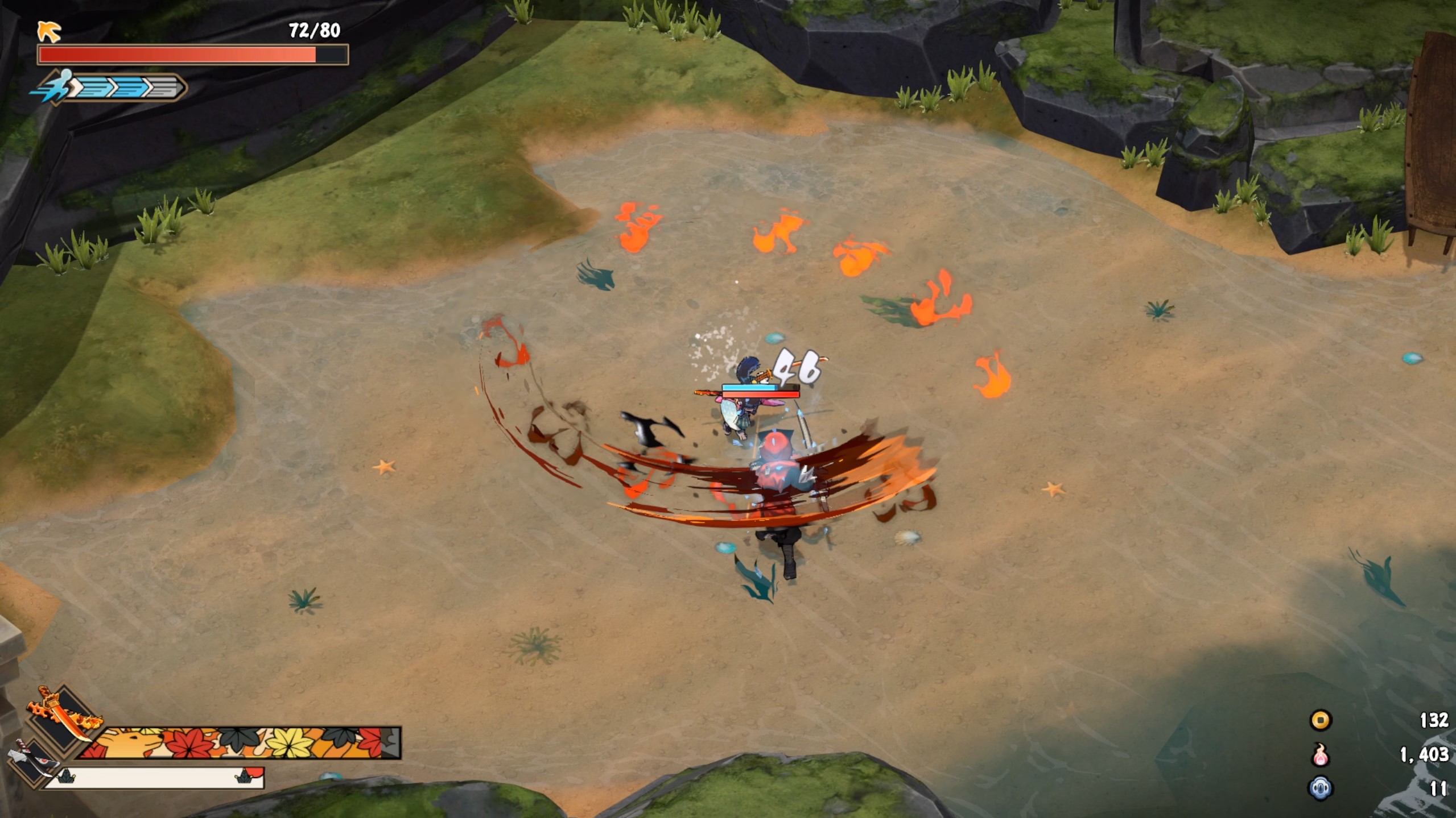เป็นหน้าที่ของเราเองที่จะทำให้เกมรู้สึกแปลกแตกต่างด้วยการเลือกอาวุธคุณสมบัติอื่น ๆ มาลองจับผสมทำคอมโบกันไปมา เช่น การใช้ดาบที่โจมตีหนักได้อย่างเดียวของ Shigure หรือการแดชไวสร้างความเสียหายรวดเร็วและฉับพลันของ Sara