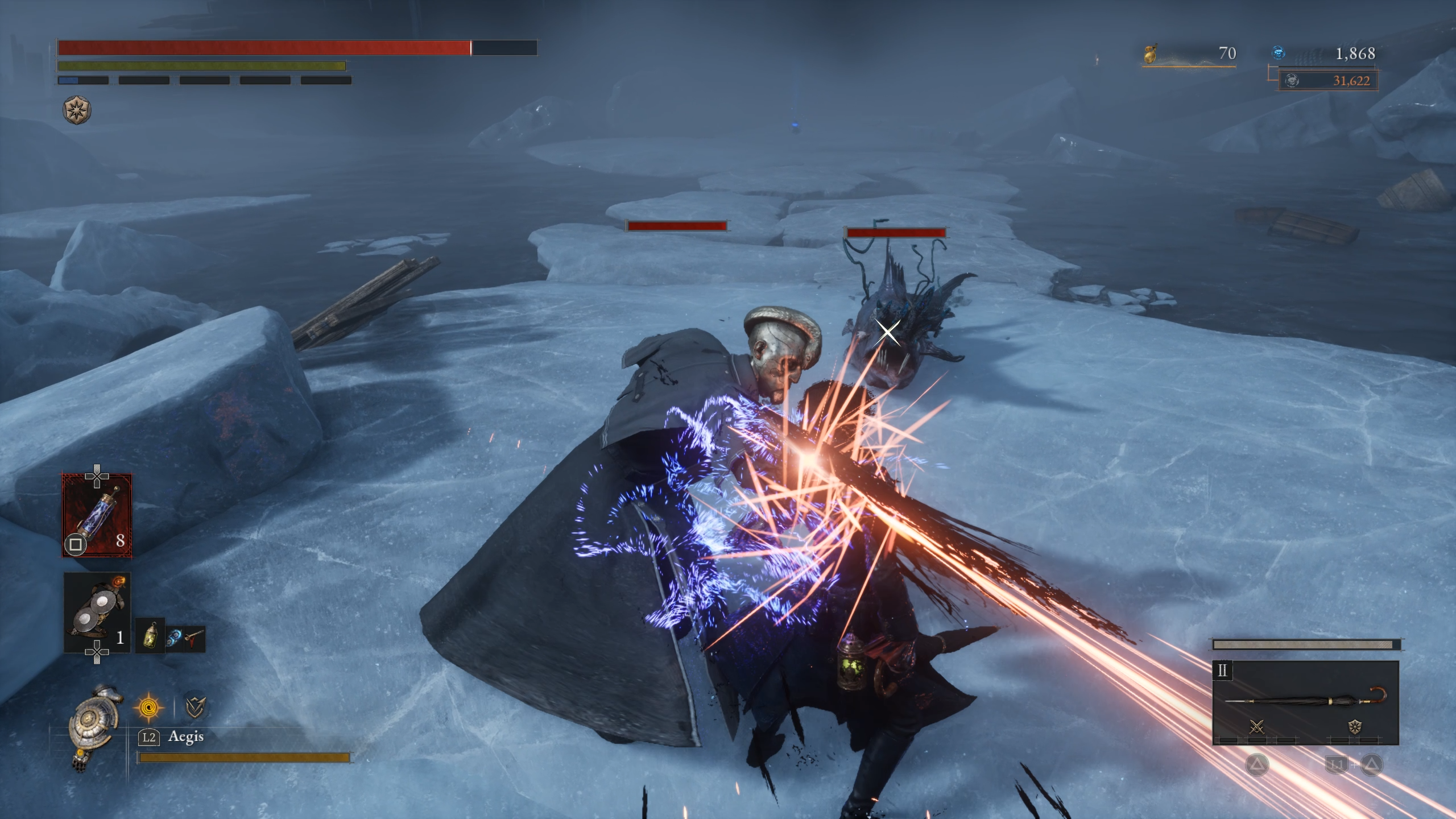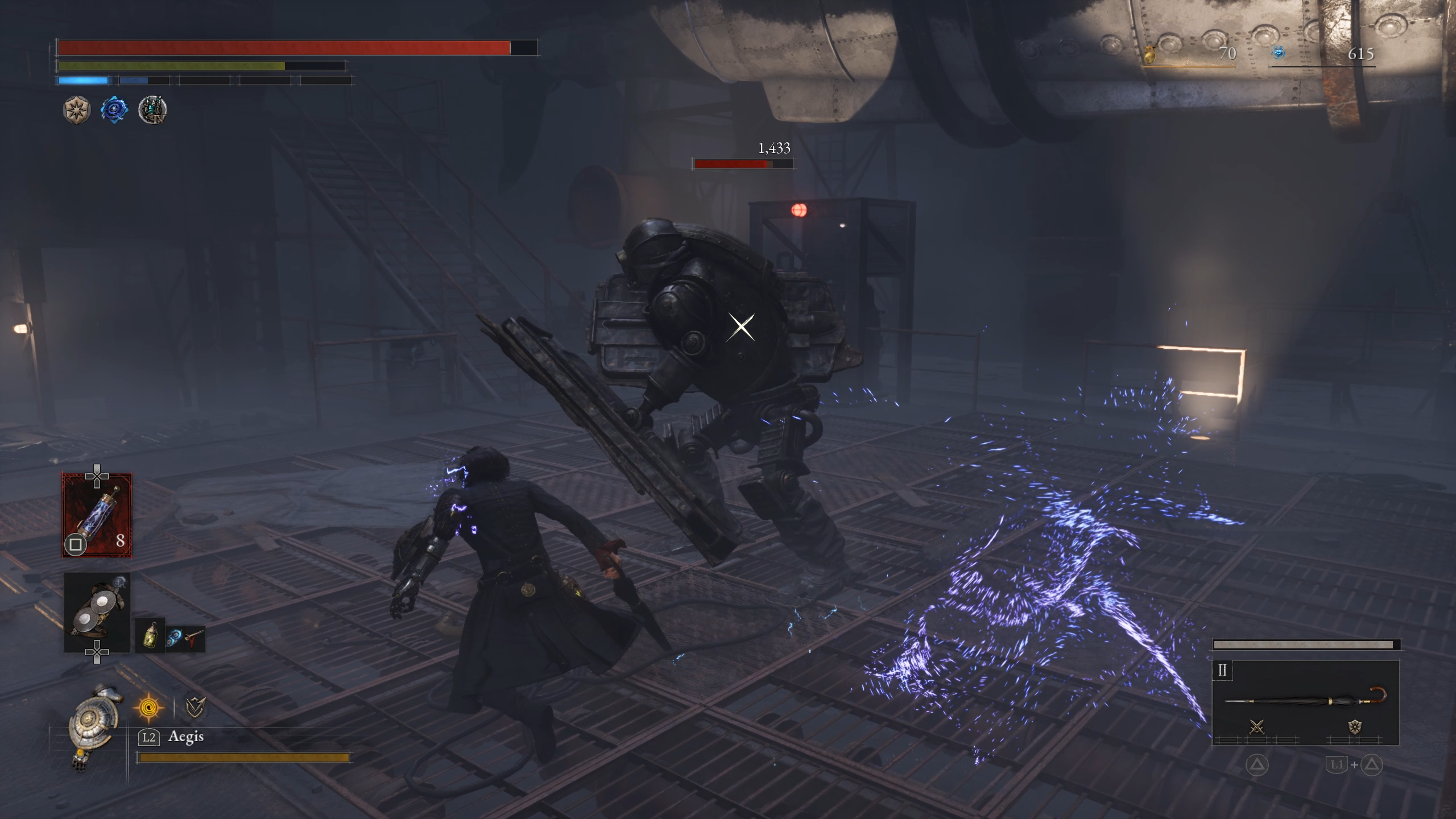 อีกส่วนที่ผมรู้สึกว่าทีมงานเลือกใส่เข้ามาได้พอเหมาะเลยก็คือพวกการนำเสนอแบบภาพยนตร์ ซึ่งเป็นสิ่งที่เราไม่ค่อยจะได้เจอในเกมตระกูลโซลส์เท่าไร ผมไม่ได้หมายถึงการตัดเข้าฉากคัตซีนแล้วปล่อยให้บอสมันโชว์ของก่อนจะสู้ แต่ผมกำลังหมายถึงการเล่นมุมกล้องในบางสถานการณ์ เช่น เรากำลังจะผ่านทางแล้วประตูดันระเบิดมีบอสโผล่ออกมา มุมกล้องเปลี่ยนมาซูมให้เห็นตัวบอสที่ยืนมอง P อยู่ มันเป็นภาษาทางภาพยนตร์ที่สื่อว่าเรากำลังจะเจอศัตรูที่ตึงมือ
