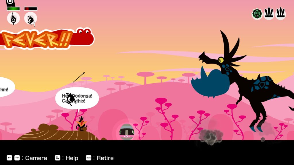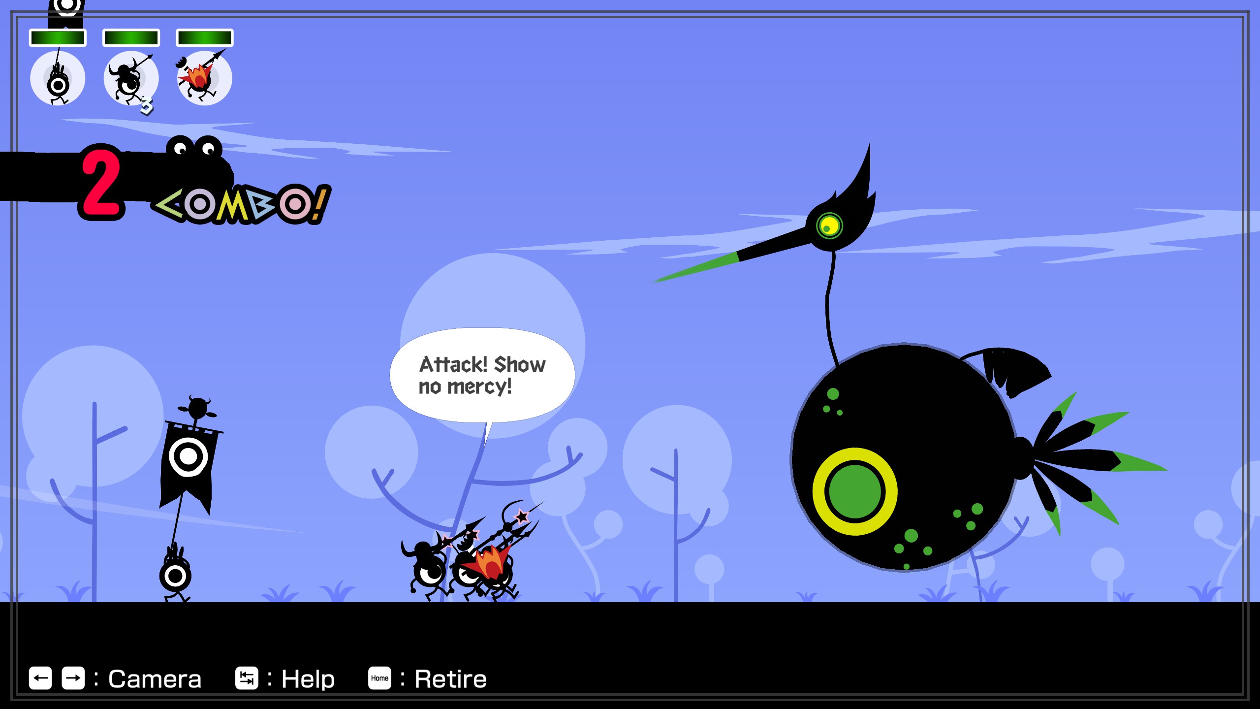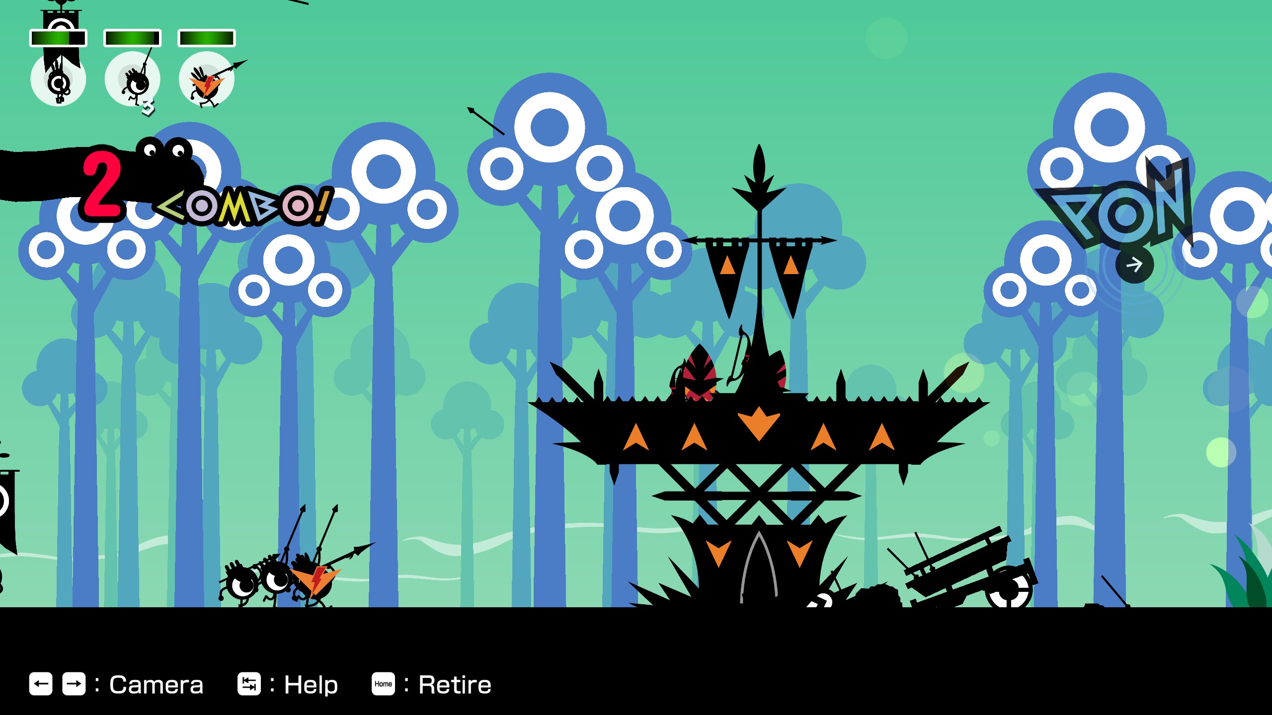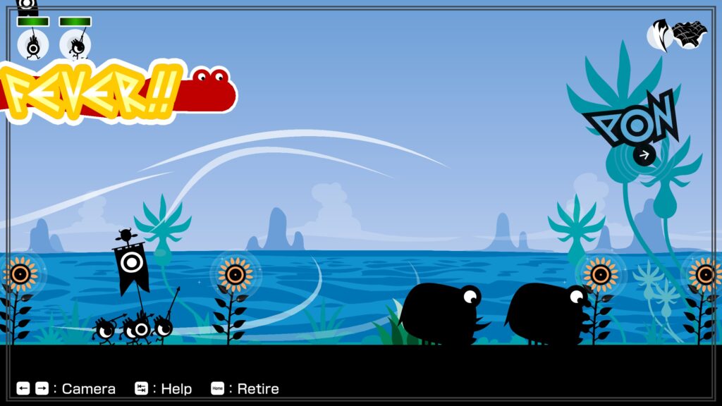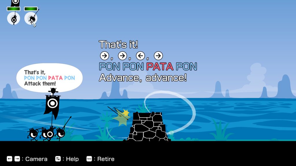 เราต้องกดปุ่มตามจังหวะเพลง เช่น Pata-Pata-Pata-Pon เท่ากับเดินหน้า หรือ Pon-Pon-Pata-Pon เท่ากับโจมตี และถ้ากดได้แม่นและต่อเนื่องจะเกิด Fever Mode ทำให้กองทัพเก่งขึ้น !
