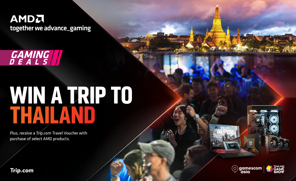 AMD พร้อมเติมพลังให้กับการผจญภัยครั้งใหม่ของเกมเมอร์! AMD ประเทศไทย ร่วมกับ Trip.com มอบโอกาสให้เกมเมอร์ผู้โชคดี 2 ท่าน รับประสบการณ์สุดพิเศษแบบจ่ายให้ทั้งหมด ซึ่งรวมถึงโรงแรมและตั๋วเข้างาน gamescom asia x Thailand Game Show หนึ่งในงานเกมที่ยิ่งใหญ่ที่สุดในภูมิภาค ระยะเวลาร่วมกิจกรรมตั้งแต่วันนี้ถึงวันที่ 14 กันยายน 2568