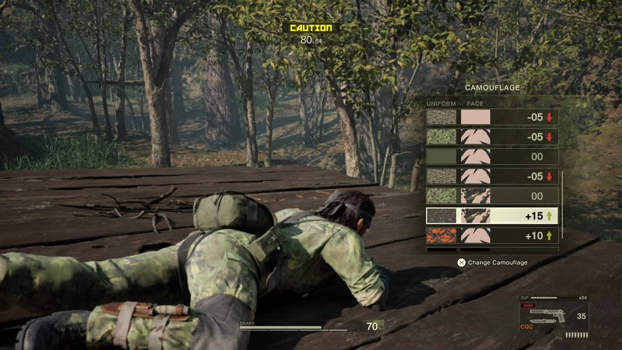 ความเด่นอีกอย่างหนึ่งที่ต้องพูดถึงก็คือระบบการพรางตัวครับ ในเกมภาคนี้จะมีชุดมากมายให้คุณได้สลับสับเปลี่ยน ซึ่งแต่ละชุดก็จะมีความเหมาะสมในการพรางตัวเข้ากับสภาพแวดล้อมนั้น ๆ ต่างกันไป พูดง่าย ๆ คือถ้าคุณหมอบหลบในพงหญ้า แต่ใส่ชุดลายไม้คุณก็จะเด่นสะดุดตา และในทางกลับกันถ้าคุณหลบแนบกำแพงอิฐแดง แต่ใส่ชุดลายใบไม้เขียวคุณก็จะโดนพบตัวได้ง่ายนั่นล่ะครับ