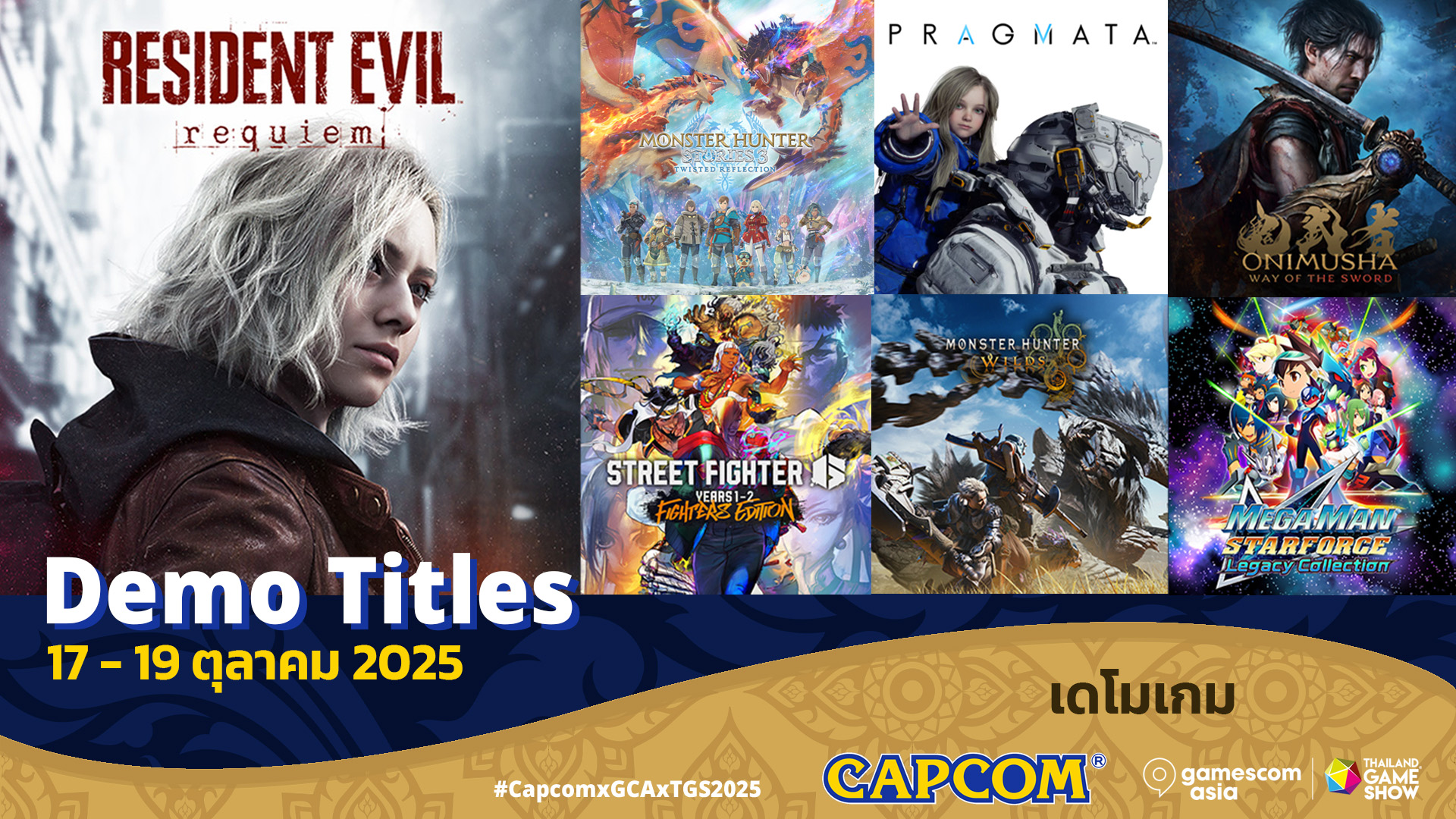 ประเทศไทย — 2 ตุลาคม 2025 — Capcom ผู้พัฒนาและผู้จัดจำหน่ายวิดีโอเกมชั้นนำระดับโลก ได้ประกาศเข้าร่วมงาน gamescom asia x Thailand Game Show 2025 ไปก่อนหน้านี้ซึ่งงานจะจัดตั้งแต่วันที่ 16 ถึง 19 ตุลาคม ณ ศูนย์การประชุมแห่งชาติสิริกิติ์ (QSNCC) ในกรุงเทพฯ โดยในวันนี้ได้มีการประกาศเกมเพิ่มเติมในรายการที่จะมีให้เล่น, กิจกรรมบนเวที, แขกรับเชิญพิเศษ, กิจกรรมสำหรับคอมมูนิตี และบูธสินค้าอย่างเป็นทางการตลอดงาน