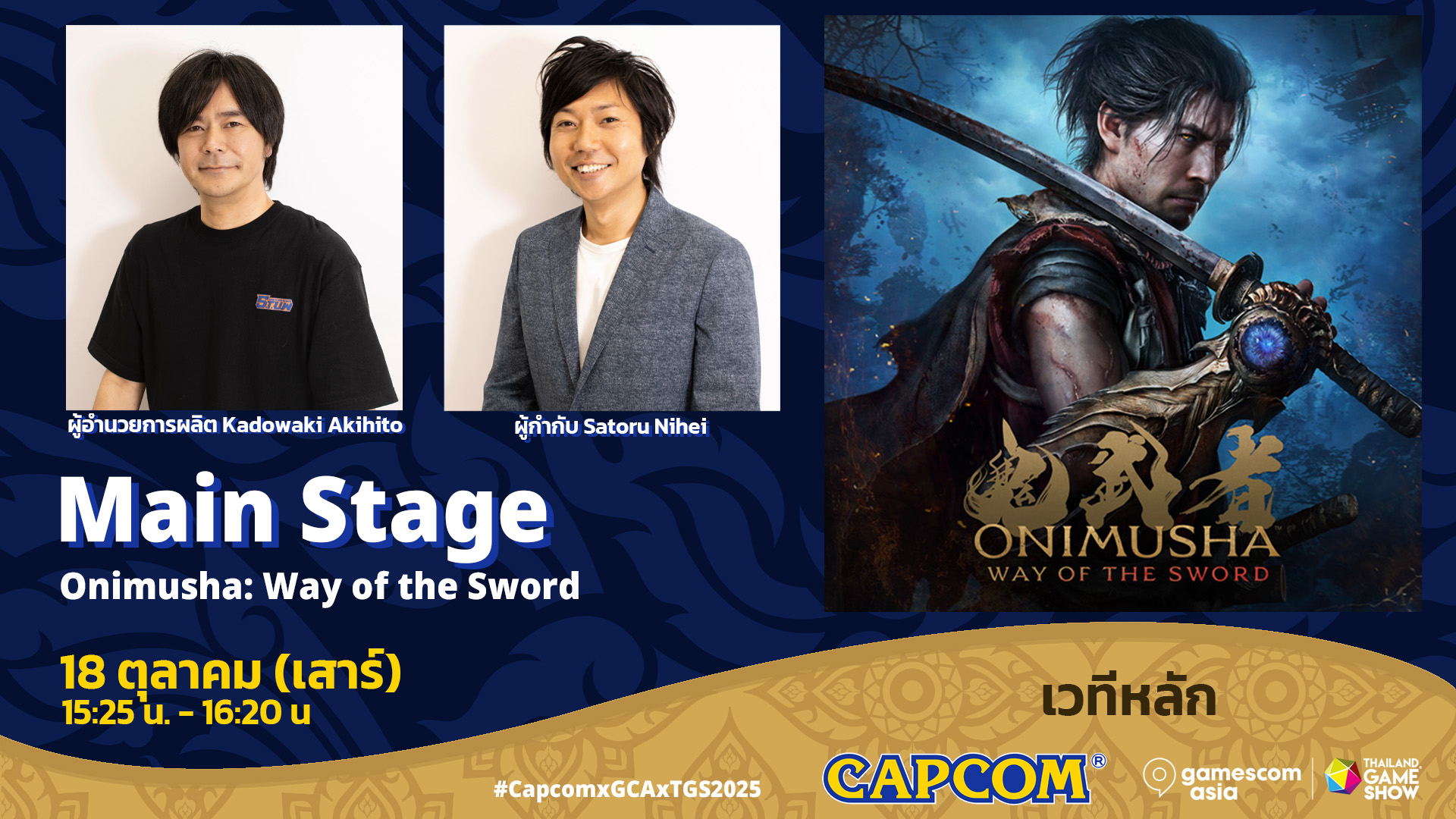 15:45 น. – 16:20 น.: Onimusha: Way of the Sword ร่วมกับผู้อำนวยการผลิต Kadowaki Akihito และผู้กำกับ Satoru Nihei