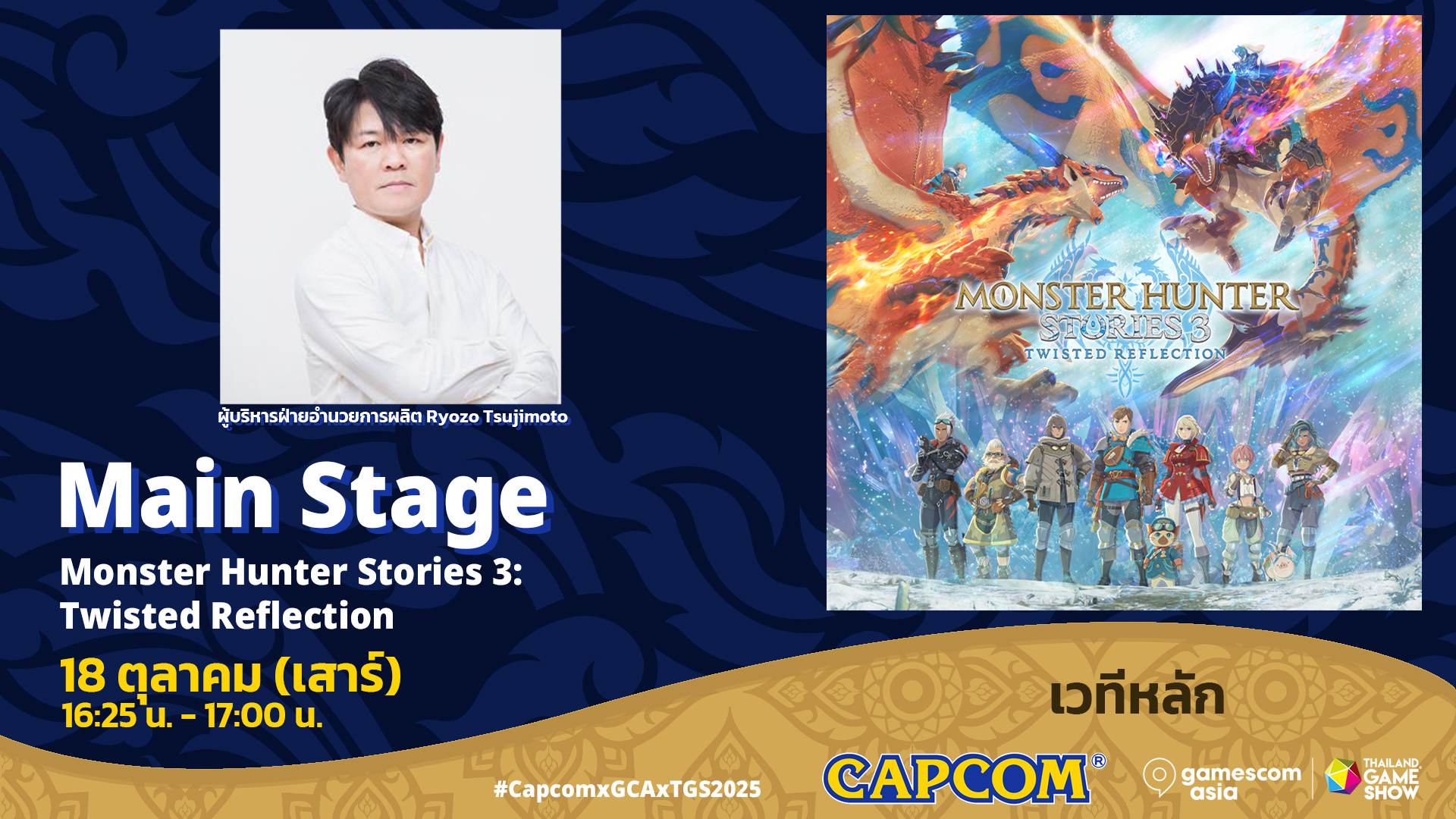 16:25 น. – 17:00 น.: Monster Hunter Stories 3: Twisted Reflection ร่วมกับผู้บริหารฝ่ายอำนวยการผลิต Ryozo Tsujimoto