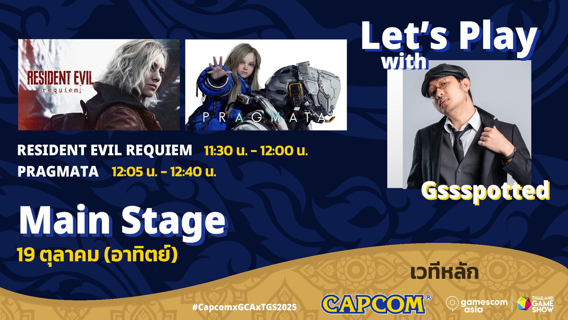 Capcom จะต้อนรับ YouTuber ชื่อดังประจำประเทศไทยอย่าง Gssspotted มาสู่รายการของ Capcom บนเวทีหลักประจำวันอาทิตย์ด้วยเช่นกัน โดย Gssspotted จะมาขึ้นเวทีและเล่นเดโมตัวล่าสุดของ Resident Evil Requiem และ PRAGMATA เพื่อให้ผู้ชมได้พบกับความบันเทิงล่าสุดของเกมที่จะวางจำหน่าย และในฐานะที่เขาเป็นคอนเทนต์ครีเอเตอร์สายเกมชื่อดังในไทย คอยมาพบกับความประทับใจและความกระตือรือร้นที่เขามีตอเกมทั้งสองได้ผ่านการเล่นเดโมสด ๆ บนเวทีและปฏิกิริยาสุดสนุกกันแบบสด ๆ เช่นกัน!