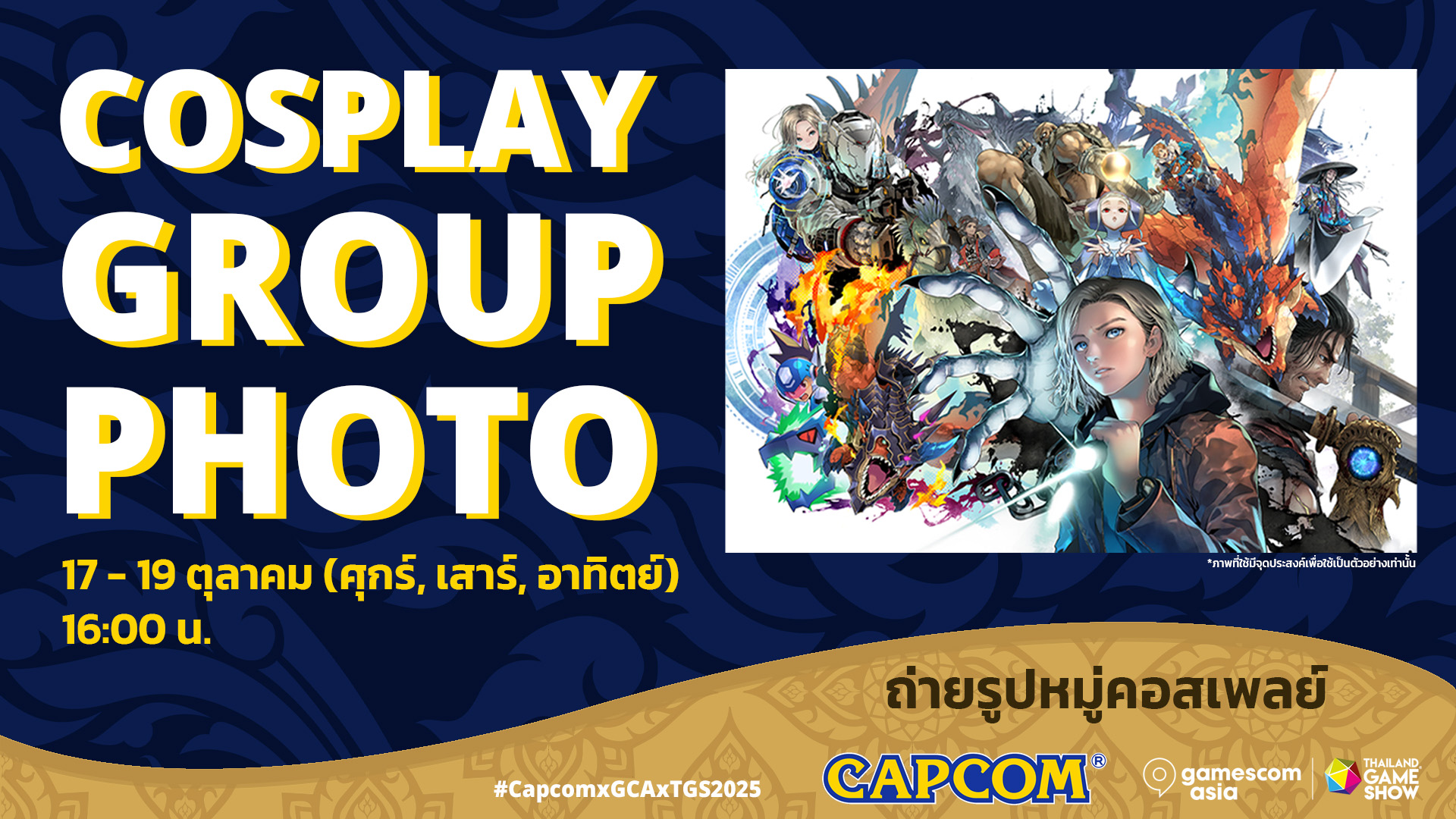 Capcom จะจัดงานรวมตัวของคอสเพลเยอร์ขนาดใหญ่ในบูธ โดยรอต้อนรับแฟน ๆ ที่แต่งกายเป็นตัวละครจากจักรวาลของ Capcom ทุกวันของงานเวลา 16:00 น. โดยขอเชิญคอสเพลเยอร์มารวมตัวกัน ณ บริเวณภาพวาดพิเศษเพื่อร่วมถ่ายภาพเป็นที่ระลึก กิจกรรมนี้จะให้ผู้เข้าร่วมได้แสดงความคิดสร้างสรรค์และแบ่งปันความหลงใหลที่มีไปด้วยกัน ซึ่งภาพถ่ายที่ระลึกนี้จะเผยแพร่บนช่องทางโซเชียลมีเดียของ Capcom SEA เพื่อเปิดโอกาสให้แฟน ๆ ได้ปรากฏตัวทั่วโลก!