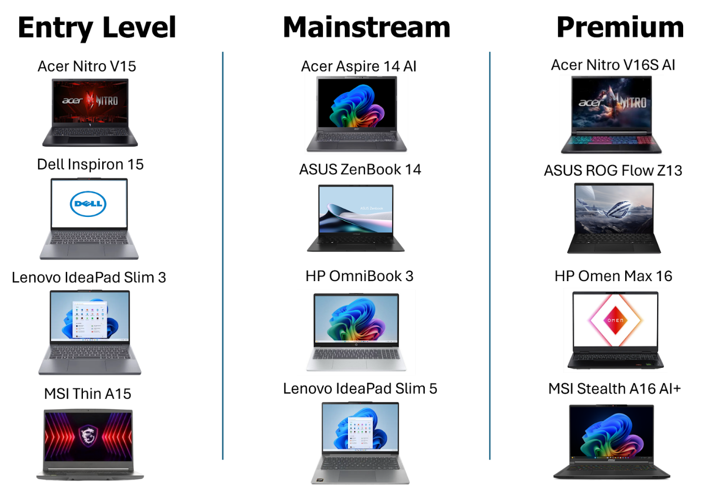 เหมาะสำหรับใคร? สำหรับนักเรียนที่เน้นการใช้งานทั่วไป เช่น งานเขียน ทำรายงาน และการใช้ฟีเจอร์ด้าน AI เป็นครั้งคราว เช่น คำบรรยายสด หรือเครื่องมือแปลภาษาผ่านเว็บแอป สำหรับนักเรียนที่ต้องใช้เพื่อการทำงานหลากหลายอย่างพร้อมกันผ่านเครื่องมือ AI – การสลับไปมาระหว่างการเรียน การใช้แอปสร้างสรรค์ผลงาน และการทำงานร่วมกัน สำหรับนักเรียนสาขาวิทยาการคอมพิวเตอร์หรือวิศวกรรมที่ต้องรันโมเดลด้าน AI, การจำลอง, คอนเทนเนอร์ หรือเฟรมเวิร์ก ML ภายในเครื่อง