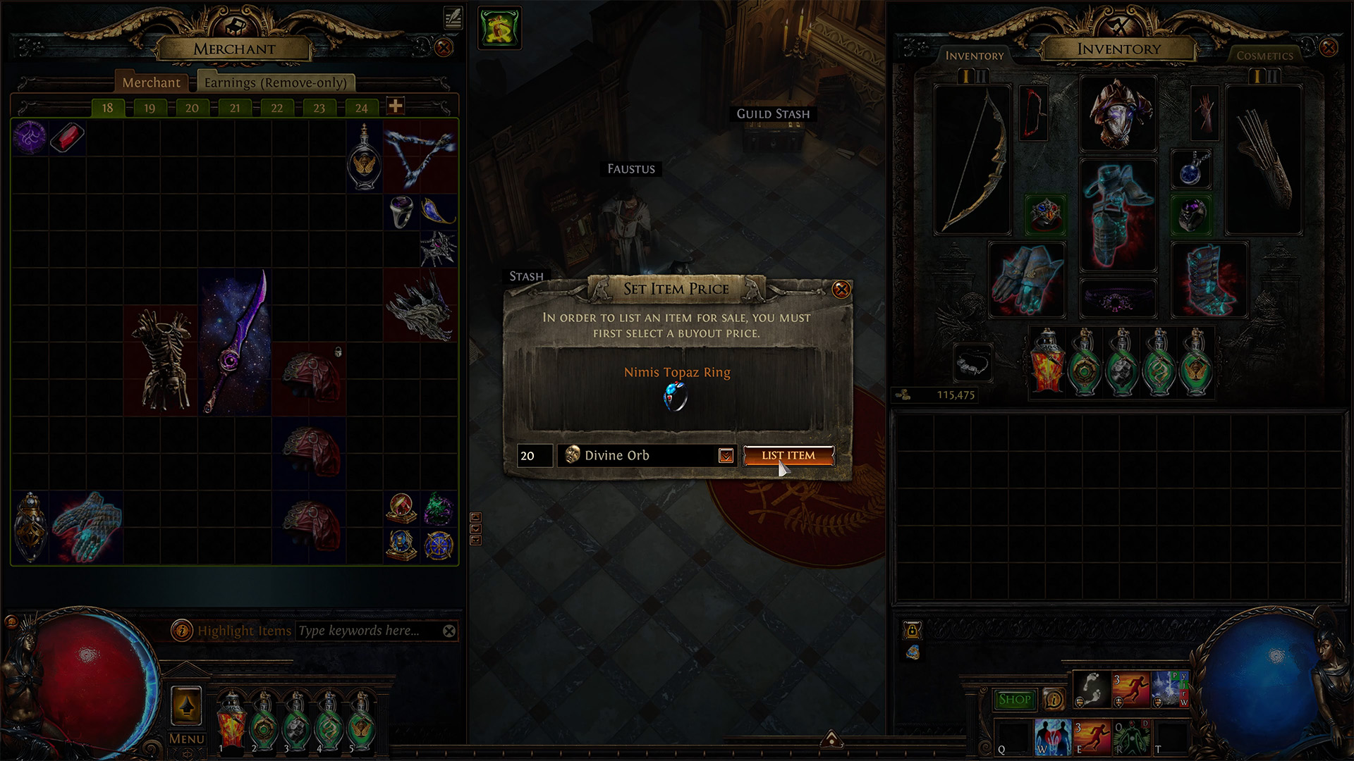 เมื่อถึง Act 6 ผู้เล่นจะได้พบกับ Faustus อดีตพ่อค้าผู้ดูแล Currency Exchange แห่ง Lioneye’s Watch ซึ่งจะมารับหน้าที่เป็นผู้ดูแล Merchant Tabs ของผู้เล่น ระบบใหม่นี้จะเปิดให้ผู้เล่นสามารถลงขายไอเทมและให้ผู้อื่นซื้อได้ทันทีแม้เจ้าของไอเทมจะออฟไลน์อยู่ก็ตาม ทำให้การซื้อขายใน Wraeclast สะดวกและรวดเร็วกว่าเดิมมาก