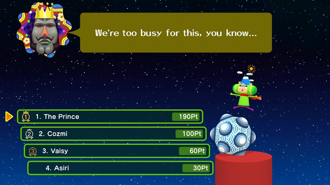 เซ็ตติ้งนี่ก็เพี้ยนและบ้าบอแบบไม่ต้องไปหาเหตุผลอะไรแล้ว พูดง่าย ๆ คือเกมเน้นความฮาและความเพี้ยนเป็นหลัก พวกบทสนทนานี่ก็ติงต๊องไม่แพ้กัน (ในแง่ดีนะ) อย่างตัวราชานี่ก็เป็นประเภทตัวฮาแต่หน้านิ่งน่ะครับ อย่างเวลาคุณเริ่มแต่ละฉากพี่แกก็จะเป็นคนพูดอธิบายว่าฉากนั้น ๆ คุณต้องทำอะไร แต่ถ้าคุณไม่ฟังแล้วเริ่มไถคาตามาริเลย พี่แกจะทำหน้าช็อกแล้วพูดทำนองว่า มันเริ่มแล้วสินะที่เราโดนเมิน เราเริ่มจะกังขาในสถานะของตนเองเสียแล้วสิ อะไรแบบนั้น