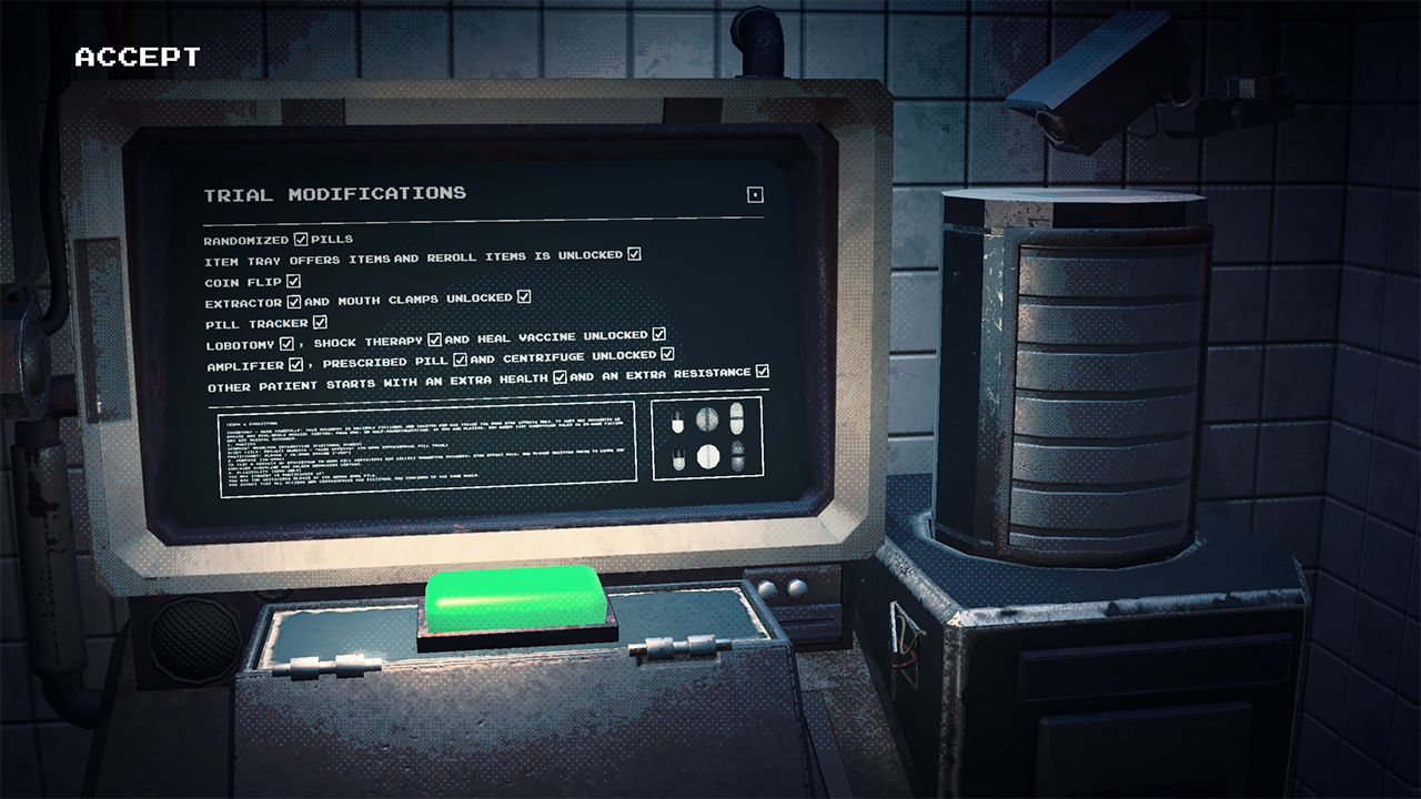 ทีเด็ดอีกอย่างก็คือไอเท็มที่ใส่มานี่แหละครับ เกมมีไอเท็มให้คุณหาทางเป็นผู้คว้าชัยในเกมมรณะนี้มากมาย ตั้งแต่เครื่องตรวจพิษยา ค้อนทุบยา ไปจนถึงเครื่องมือสุดโหดอย่างการดึงลูกตาเราไปยัดใส่คอศัตรู ทำให้ศัตรูคนนั้นมีค่าภูมิต้านทานสูงสุดลดลงถาวร มีคีมที่ดึงฟันอีกฝ่ายออกมาแบบสด ๆ ลดค่าภูมิต้านทานได้ทันที 1 แต้ม มีกระทั่งเครื่องง้างปากบังคับศัตรูให้กินยา 1 เม็ด