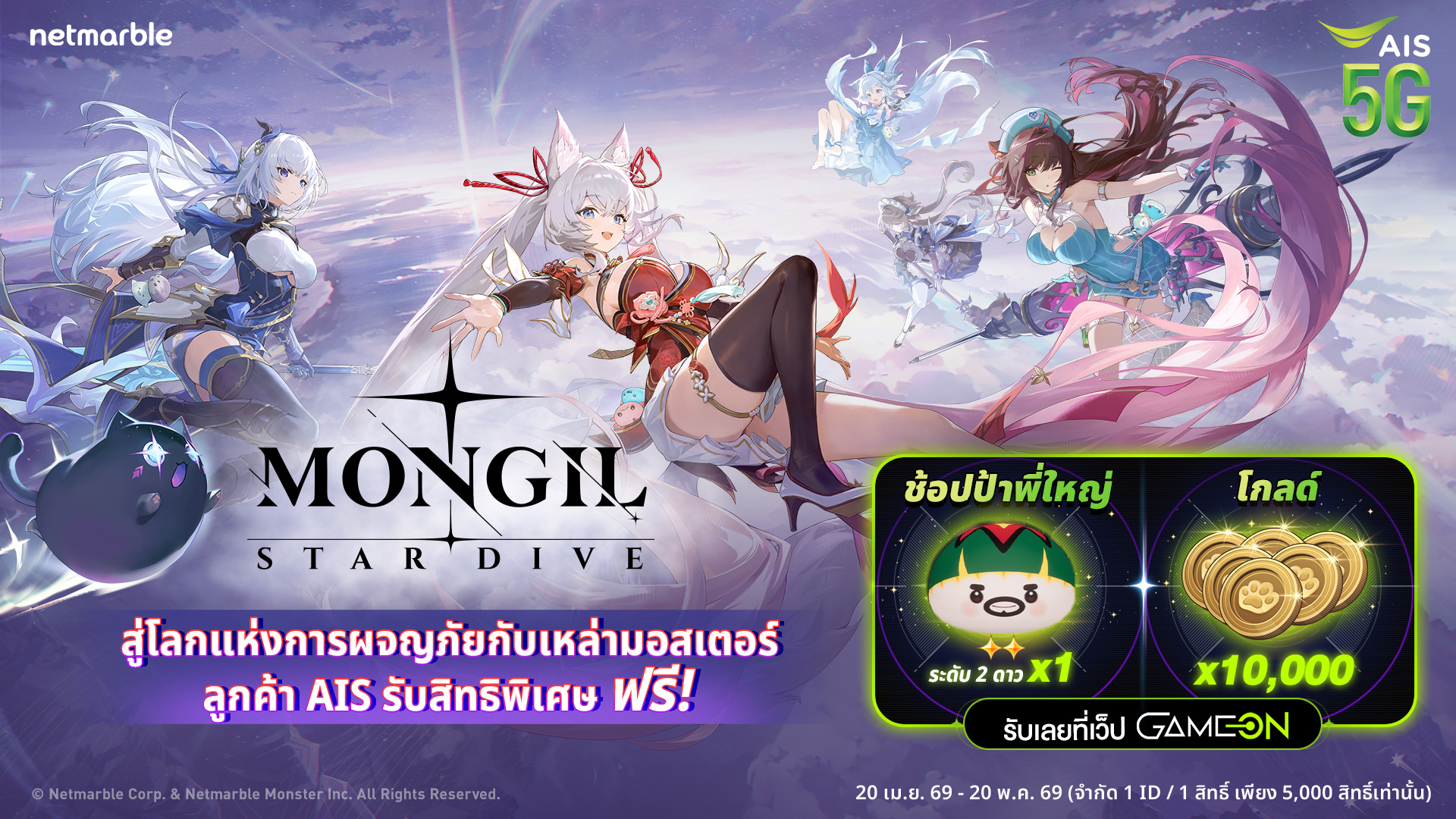 กรุงเทพฯ, ประเทศไทย (วันที่ 20 เมษายน พ.. 2569) – เน็ตมาร์เบิ้ล ผู้พัฒนาและผู้เผยแพร่เกมคุณภาพสูงชั้นนำ จับมือร่วมกับ AIS ต้อนรับเกม RPG แอ็กชันฝึกฝนมอนสเตอร์สุดน่ารักใหม่ล่าสุดอย่าง MONGIL: STAR DIVE แจกไอเทมฟรี ‘ช้อปป้าพี่ใหญ่ ระดับ 2 ดาว x1’ และ ‘โกลด์ x10,000’ พิเศษสำหรับลูกค้า AIS บนเว็บ Game On เท่านั้น ! สามารถติดตามรายละเอียดเพิ่มเติมได้เว็บไซต์ พร้อมร่วมกิจกรรมได้แล้วตั้งแต่วันนี้ถึง 20 พฤษภาคม 2569 หรือจนกว่าสิทธิพิเศษจะหมด