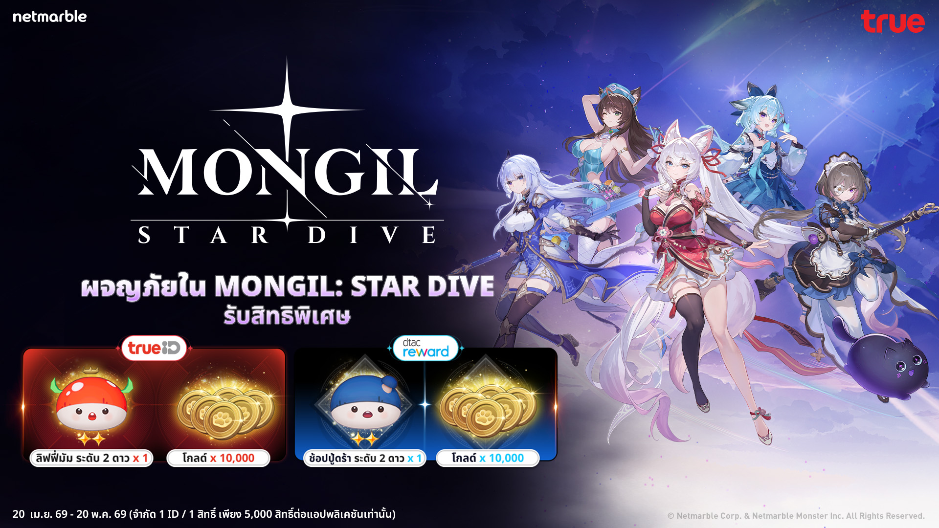 กรุงเทพฯ, ประเทศไทย (วันที่ 28 เมษายน พ.ศ. 2569) – เน็ตมาร์เบิ้ล ผู้พัฒนาและผู้เผยแพร่เกมคุณภาพสูงชั้นนำ จับมือร่วมกับ TrueID และ DTAC มอบสิทธิพิเศษสำหรับลูกค้าทรูและดีแทค แลกรับไอเทมเกม MONGIL: STAR DIVE ฟรี โดยลูกค้าทรู ใช้ 0 ทรูพอยท์ แลกรับไอเทม ‘ลิฟฟี่มัม ระดับ 2 ดาว x1’ และ ‘โกลด์ x10,000’ สำหรับลูกค้าดีแทคใช้ 0 คอยน์ แลกรับไอเทม ‘ช้อปปู้ดร้า ระดับ 2 ดาว x1’ และ ‘โกลด์ x 10,000’ สามารถร่วมกิจกรรมได้แล้วตั้งแต่วันนี้ถึง 20 พฤษภาคม 2569 หรือจนกว่าสิทธิ์จะหมด